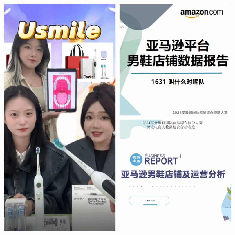 跨境电商网络直播赛道要求采用纯英文进行,从直播产品、编导、主播、运营等直播全流程进行考核。重点考察主播的英语水平、对产品卖点的挖掘、商品特性的展示技巧、直播间前景后景搭建、直播团队的协助能力等。我院“重生之成为女主播队”(指导老师:刘伟 黄菁菁)搭建“Usmile电动牙刷”直播间,在该赛道荣获一等奖。
