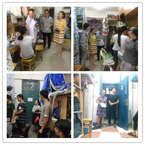 辅导员深入宿舍检查安全隐患。学院成立了新老区以党总支书记和副书记带队,辅导员为成员的检查小组。深入学生宿舍,对用电安全、门窗安全等存在的安全隐患进行了排查;并督促学生共同维护好宿舍卫生,营造干净、向上的宿舍氛围;假期将至,妥善管理好贵重物品,关好门窗。