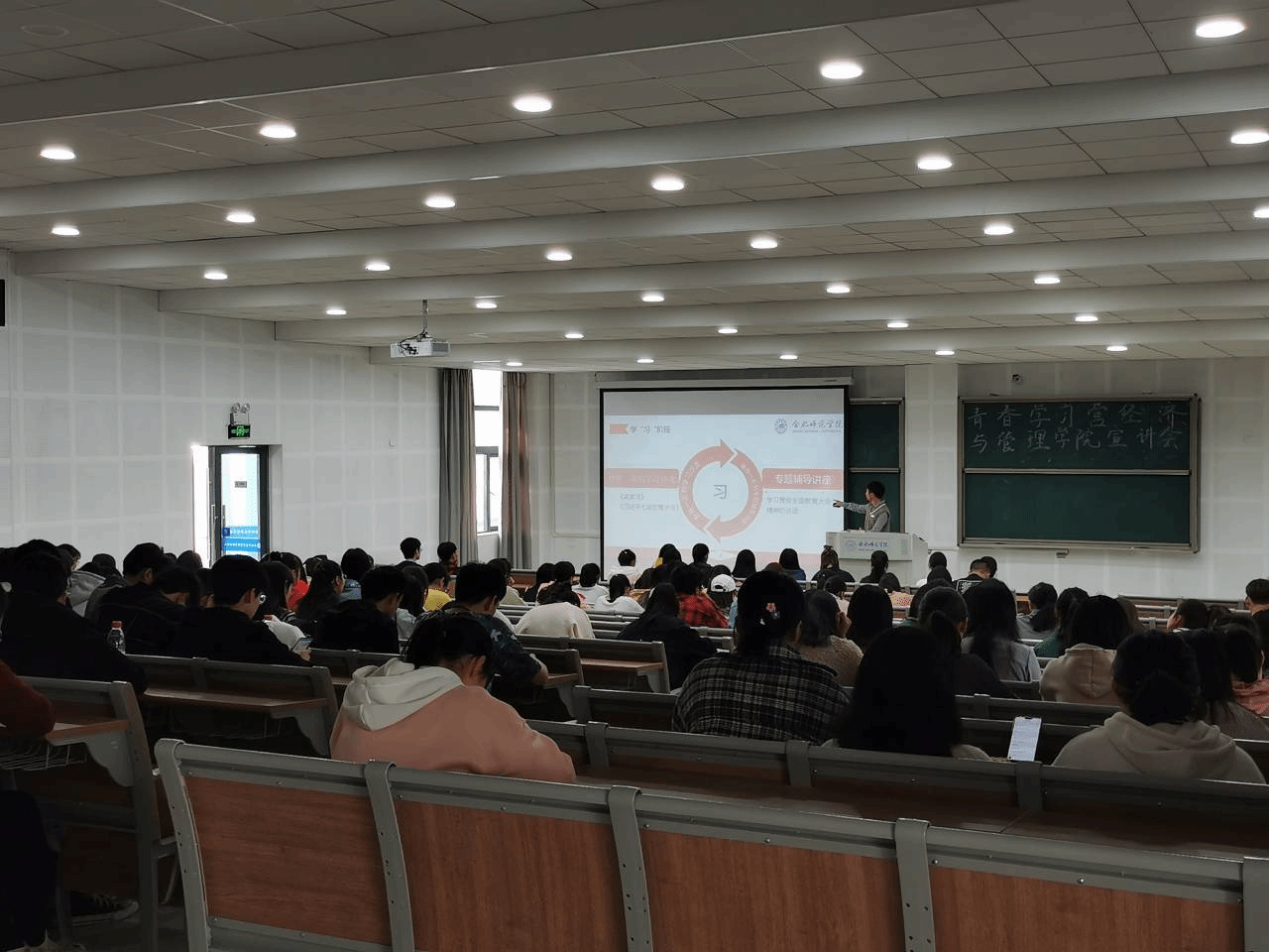 此次宣讲会活动旨在深入学习贯彻全国教育大会及新时代高等学校本科教育工作会议精神,全面提升学生思想综合素质,通过宣讲会的形式向同学们讲述大学阶段在学习生活上遇到的各种问题与解决的方法。2017级财务管理专业的刘长青同学分别从学“习”阶段、讲“习”阶段和传“习”阶段三个方面,向同学们讲述了自己参加青春学习营的经历与收获,为2019级大一新生们的大学生活发展规划提供了丰富的意见指导。