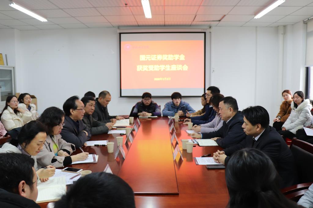 副校长姚本先代表学校向李克木主任一行来我校参加座谈会表示热列欢迎,对国元证券在我校设立奖助学金表示衷心感谢,对国元证券不忘社会责任,投身公益事业,支持教育事业的做法给与了高度的赞扬。他希望各位受助同学要努力创造优异的成绩,为校争光,回报社会。