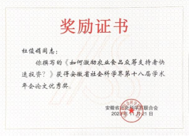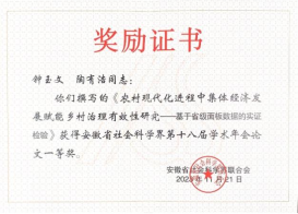 近年来,经管学院高度重视科研团队培育。此次年会征文,学院通过组织科研团队,共动员投稿十多篇,其中钟玉文和科研处陶有浩合作的论文《农村现代化进程中集体经济发展赋能乡村治理有效性研究——基于省级面板数据的实证检验》、丁红梅、黄虹、杨晨合作撰写的论文《安徽省旅游-金融-乡村振兴耦合协调发展研究》分别获得一等奖;杜俊娟撰写的《如何激励农业食品众筹支持者快速投资?》获得优秀奖。(国产清纯白嫩初高生害羞:钟玉文)