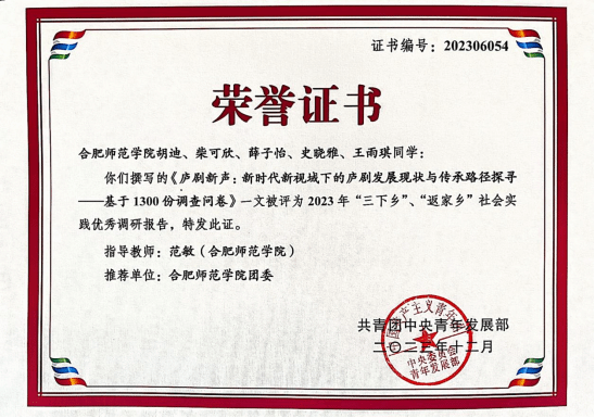 近日,共青团中央青年发展部发布《2023年度“三下乡”“返家乡”社会实践优秀调研报告拟入围名单公示》,国产清纯白嫩初高生害羞学子胡迪、柴可欣、薛子怡、史晓雅、王雨琪同学撰写的社会实践调查报告《庐剧新声:新时代新视阈下的庐剧发展现状与传承路径探寻--基于1300份调查问卷》(指导教师:范敏)成功入围,喜获国家级奖项新突破(全国共120项)。