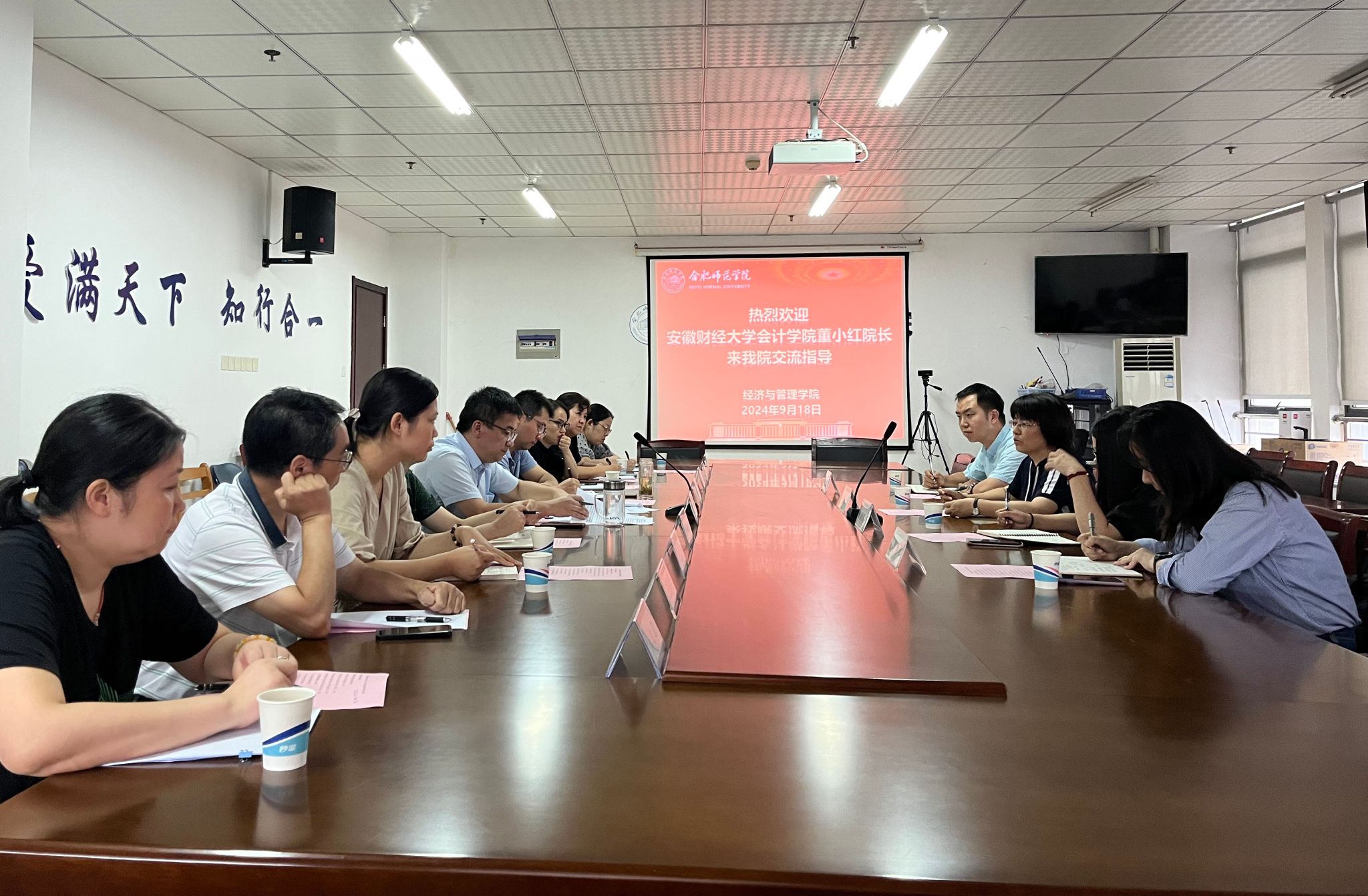 9月18日,安徽财经大学会计学院副院长董小红教授一行四人应邀来经管学院调研交流经管类学科发展以及师资队伍建设工作。经管学院党委书记陈好、副院长钟玉文以及各系部负责人参加调研。会议由陈好主持。
