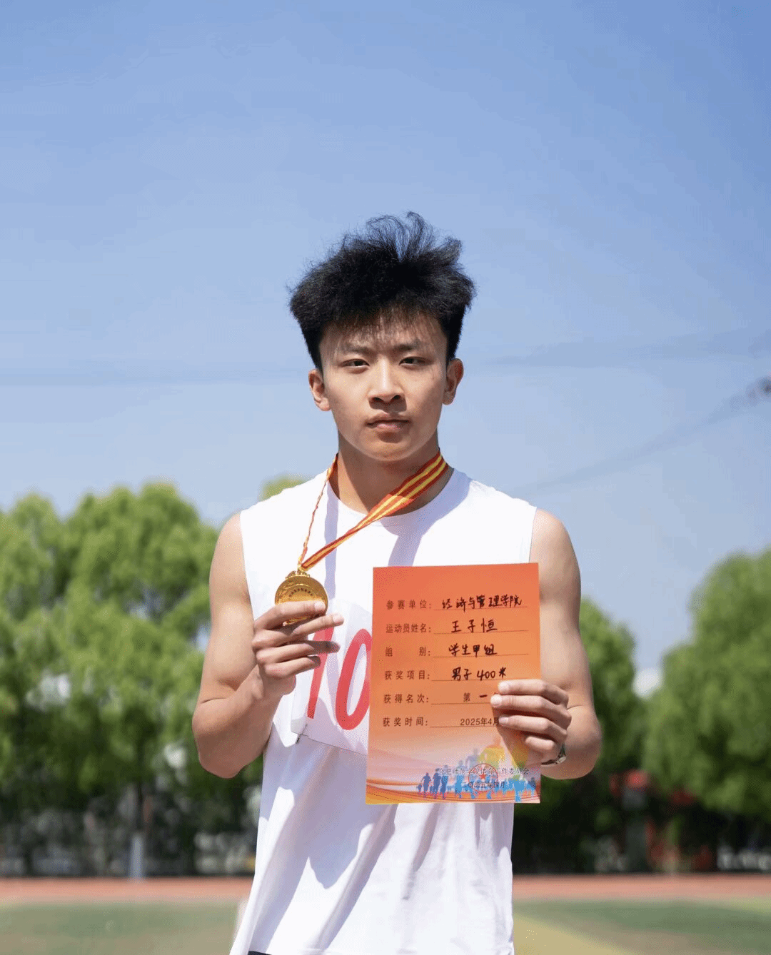 面对初涉中短跑的学弟学妹,王子恒分享了循序渐进的训练理念:“从慢跑打好有氧基础,再逐步加入间歇跑,让身体适应速度变化,这是提升成绩的关键。”谈及未来目标,他目光坚定:“下一届校运会,我要在400米和800米项目上继续突破速度瓶颈,用更快的成绩证明自己。”此外,他所在的团队在4×400米接力赛中获第三名、4×100米接力赛获第六名,用实力诠释了个人与团队的双重担当。