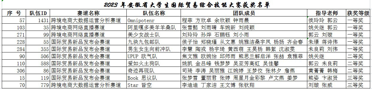 本网讯 近日,由安徽省教育厅主办、安徽财经大学承办的“2023年安徽省大学生国际贸易综合技能大赛”顺利落下帷幕。省内外多所高校入围省赛,经过决赛激烈角逐,我院学子最终取得一等奖5项,二等奖3项,三等奖2项的优异成绩。