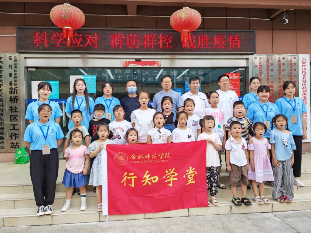 本网讯7月4日,为响应“喜迎党的二十大、永远跟党走、奋进新征程”的号召,我院7名小先生来到蜀山区高刘镇新桥社区,在社区工作站人员的协同下共同开办暑期“行知学堂”志愿者活动。在开班仪式上,社区工作站负责人员,7名小先生、30位小学员及家长到场参加。
