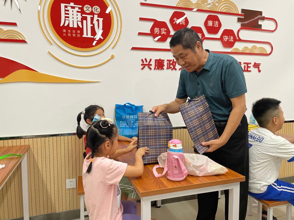 沈辉、陶敏向小朋友们赠送了精美学习文具,并鼓励小朋友们要好好学习,度过一个充实的暑假。