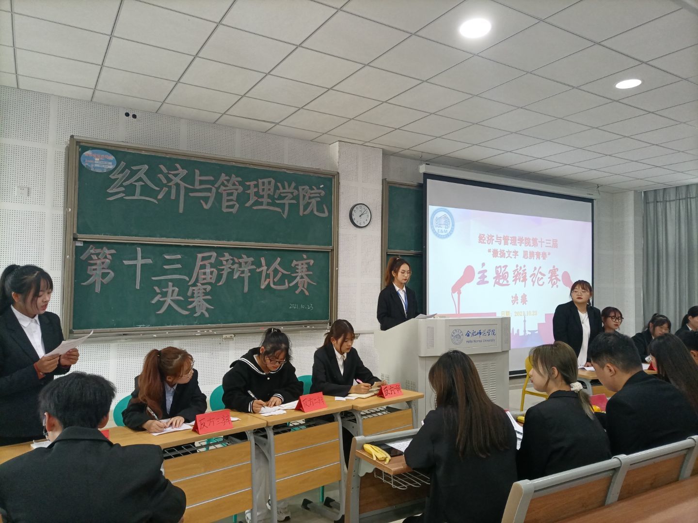 本网讯以论明理、以辩会友。10月23日下午,国产清纯白嫩初高生害羞主办的第十三届主题辩论赛决赛于在滨湖校区博学楼D101顺利举行。此次辩论赛邀请学院学生会主席团以及我校辩论队的优秀队员担任本次大赛评委,各专业班级代表参加此次活动。